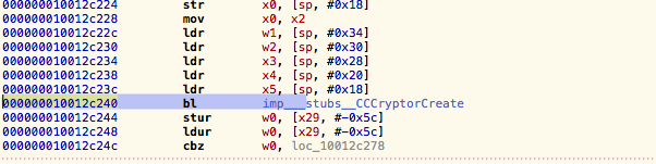 unsigned char str[] = { ('a' ^ 'C'), ('a' ^ 'C'), ('a' ^ 'C'), ('a' ^ 'r'), ('a' ^ 'y'), ('a' ^ 'p'), ('a' ^ 't'), ('a' ^ 'o'), ('a' ^ 'r'), ('a' ^ 'C'), ('a' ^ 'r'), ('a' ^ 'e'), ('a' ^ 'a'), ('a' ^ 't'), ('a' ^ 'e'), ('a' ^ '/0') }; unsigned char * p = str; while (((*p) ^= 'a') != '/0') p++;CCCryptorStatus (* CCCryptorCreate_p)( CCOperation op, /* kCCEncrypt, etc. */ CCAlgorithm alg, /* kCCAlgorithmDES, etc. */ CCOptions options, /* kCCOptionPKCS7Padding, etc. */ const void *key, /* raw key material */ size_t keyLength, const void *iv, /* optional initialization vector */ CCCryptorRef *cryptorRef) /* RETURNED */ __OSX_AVAILABLE_STARTING(__MAC_10_4, __IPHONE_2_0) = dlsym(handle, (const char *)str);4、用函數指針加密