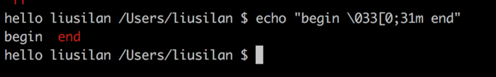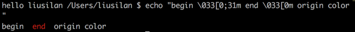 比如/033[0;31m代表紅色。如果在終端中敲入:echo "begin /033[0;31m end" ,end會顯示為紅色,begin還是原本設置的原色,就簡稱為本色吧。效果如下: