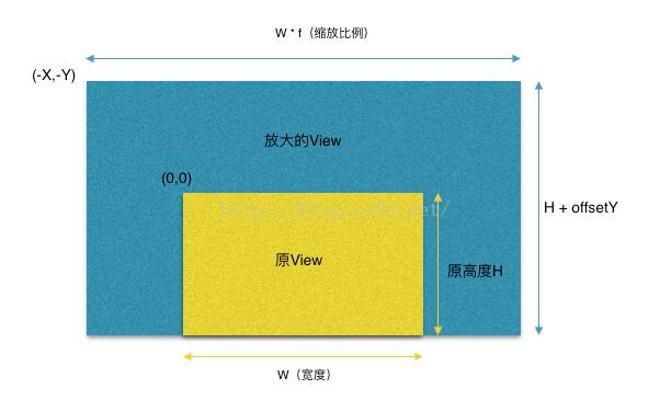 之后自己摸索,調整后,我是用偏移量來控制里面的imageView的大小,imageView是我設置的HeardView的子視圖,而heardView和TableViewheard的大小不會根據imageView變化,只是坐標變了,其實這是一種錯覺,真實的效果是imageView坐標向左上方偏移,大小也變化,而heardView和TableViewheard沒變大,但imageView變大的部分蓋住他們的上方,讓我們覺得heardView和TableViewheard也變大了,可以參考文章下面的邏輯圖。
