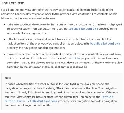 有l(wèi)eftBarButtonItem則優(yōu)先顯示當(dāng)前VC的leftBarButtonItem,無(wú)則顯示上個(gè)VC的backBarButtonItem,再無(wú)則顯示上個(gè)VC的title(參考官網(wǎng) 還是官網(wǎng)解釋的清楚)
