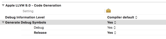 Enables or disables generation of debug symbols. When debug symbols are enabled, the level of detail can be controlled by the Debug Information Format (DEBUG_INFORMATION_FORMAT) setting.