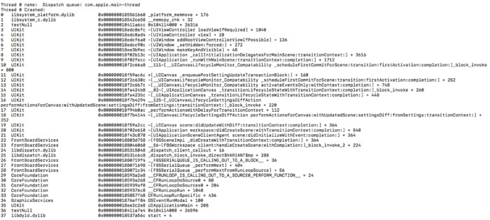 Exception Type: EXC_BAD_ACCESS (SIGSEGV)Thread 0 name: Dispatch queue: com.apple.main-threadThread 0 Crashed:0 testNull 0x000000010494aacc 0x104944000 + 273401 testNull 0x000000010494aac8 0x104944000 + 273362 testNull 0x000000010494a6b0 0x104944000 + 262883 UIKit 0x000000018cec4efc -[UIViewController loadViewIfRequired] + 10404 UIKit 0x000000018cec4ad4 -[UIViewController view] + 285 UIKit 0x000000018cecb6a0 -[UIWindow addRootViewControllerViewIfPossible] + 1366 UIKit 0x000000018cec890c -[UIWindow _setHidden:forced:] + 2727 UIKit 0x000000018cf379ec -[UIWindow makeKeyAndVisible] + 48