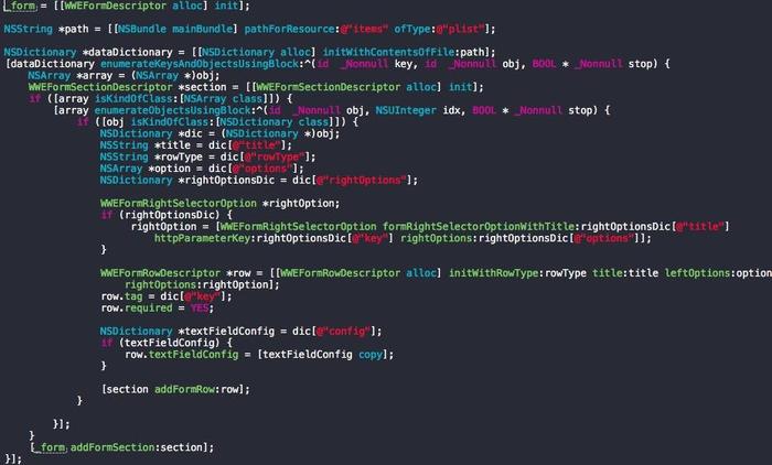 另外,將表單配置數據獨立出來,而不是寫死在代碼中。使用plist文件,這樣初始化form時只需讀取這個文件,就完成了cell的配置。后續如果要改動表單的內容,不改動樣式,就只需修改plist文件,而無需改動代碼。