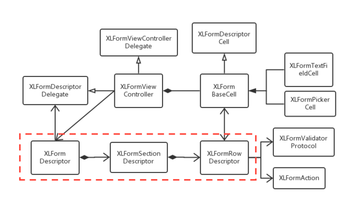 最主要的是紅色方框的三個類:XLFormRowDescriptor, XLFormSectionDescriptor,XLFormDescriptor。XLFormDescriptor結構和UITablView一樣,有Section,有Row,它就是為成為UITableView的數據源而設計的。XLFormRowDescriptor定義了每行表單的數據內容,包括行樣式,標題,行類型,選擇項內容,標簽,合法性驗證等。XLFormSectionDescriptor是由XLFormRowDescriptor組合而成的,而XLFormSectionDescriptor最終又組成了XLFormDescriptor。