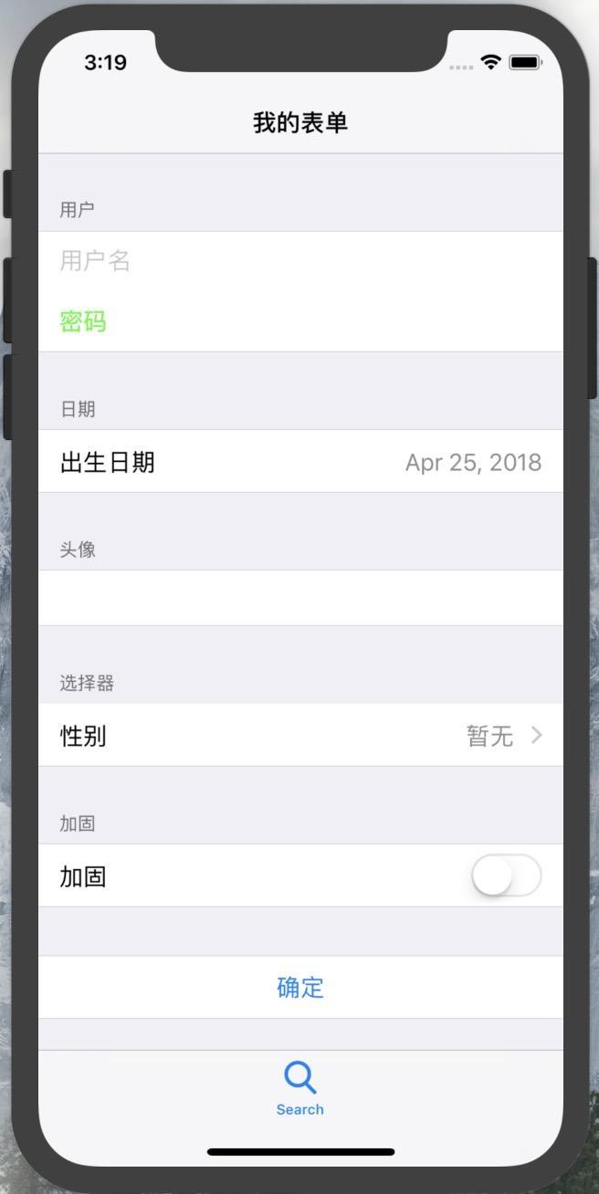 - (void)initializeForm { // 設置是否顯示Cell之間分界線 //self.tableView.separatorStyle = UITableViewCellSeparatorStyleNone; // 設置Section的高度 self.tableView.sectionHeaderHeight = 30; XLFormDescriptor * form;//form,一個表單只有一個 XLFormSectionDescriptor * section;//section,一個表單可能有多個 XLFormRowDescriptor * row; //row,每個section可能有多個row // Form form = [XLFormDescriptor formDescriptor]; // First section section = [XLFormSectionDescriptor formSection]; section.title = @"用戶"; [form addFormSection:section]; // 普通文本 row = [XLFormRowDescriptor formRowDescriptorWithTag:@"username" rowType:XLFormRowDescriptorTypeText]; // 設置placeholder [row.cellConfig setObject:@"用戶名" forKey:@"textField.placeholder"]; // 設置文本顏色 [row.cellConfig setObject:[UIColor redColor] forKey:@"textField.textColor"]; [section addFormRow:row]; // 密碼 row = [XLFormRowDescriptor formRowDescriptorWithTag:@"password" rowType:XLFormRowDescriptorTypePassword]; // 設置placeholder的顏色 NSAttributedString *attrString = [[NSAttributedString alloc] initWithString:@"密碼" attributes: @{NSForegroundColorAttributeName:[UIColor greenColor], }]; [row.cellConfig setObject:attrString forKey:@"textField.attributedPlaceholder"]; [section addFormRow:row]; // Second Section section = [XLFormSectionDescriptor formSection]; section.title = @"日期"; [form addFormSection:section]; // 日期選擇器 row = [XLFormRowDescriptor formRowDescriptorWithTag:@"birthday" rowType:XLFormRowDescriptorTypeDate title:@"出生日期"]; row.value = [NSDate dateWithTimeIntervalSinceNow:60*60*24]; [section addFormRow:row]; // Third Section section = [XLFormSectionDescriptor formSection]; section.title = @"頭像"; [form addFormSection:section]; // 圖片選擇 row = [XLFormRowDescriptor formRowDescriptorWithTag:@"userpic" rowType:XLFormRowDescriptorTypeImage]; [section addFormRow:row]; // Fourth Section section = [XLFormSectionDescriptor formSection]; section.title = @"選擇器"; [form addFormSection:section]; // 選擇器 row = [XLFormRowDescriptor formRowDescriptorWithTag:@"sex" rowType:XLFormRowDescriptorTypeSelectorPush]; row.noValueDisplayText = @"暫無"; row.selectorTitle = @"性別選擇"; row.selectorOptions = @[@"男",@"女",@"其他"]; row.title = @"性別"; [row.cellConfigForSelector setObject:[UIColor redColor] forKey:@"textLabel.textColor"]; [row.cellConfigForSelector setObject:[UIColor greenColor] forKey:@"detailTextLabel.textColor"]; [section addFormRow:row]; // Fifth Section section = [XLFormSectionDescriptor formSection]; section.title = @"加固"; [form addFormSection:section]; // 開關 row = [XLFormRowDescriptor formRowDescriptorWithTag:@"enforce" rowType:XLFormRowDescriptorTypeBooleanSwitch title:@"加固"]; [section addFormRow:row]; // Sixth Section section = [XLFormSectionDescriptor formSection]; [form addFormSection:section]; // 按鈕 row = [XLFormRowDescriptor formRowDescriptorWithTag:@"conform" rowType:XLFormRowDescriptorTypeButton]; row.title = @"確定"; [section addFormRow:row]; self.form = form;}-(void)didSelectFormRow:(XLFormRowDescriptor *)formRow{ // 判斷是不是點擊了確定按鈕 if([formRow.tag isEqualToString:@"conform"] && formRow.rowType == XLFormRowDescriptorTypeButton){ //獲取表單所有到的值 NSDictionary *values = [self formValues]; NSLog(@"%@", values); } [super didSelectFormRow:formRow];}//重寫改該方法 上面的方法就不會調用了//-(void)tableView:(UITableView *)tableView didSelectRowAtIndexPath:(NSIndexPath *)indexPath{//// NSLog(@"%s", __func__);////}@end四、效果圖