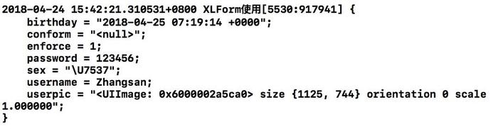 5、如何獲取設置好的表單的值?其實非常簡單,該框架提供一個方法formValues,它的返回類型是一個NSDictionary,其中key就是XLFormRowDescriptor設置時的Tag。可以直接在控制器中調用該方法獲取表單值,上面的效果圖設置后的表單信息如下: