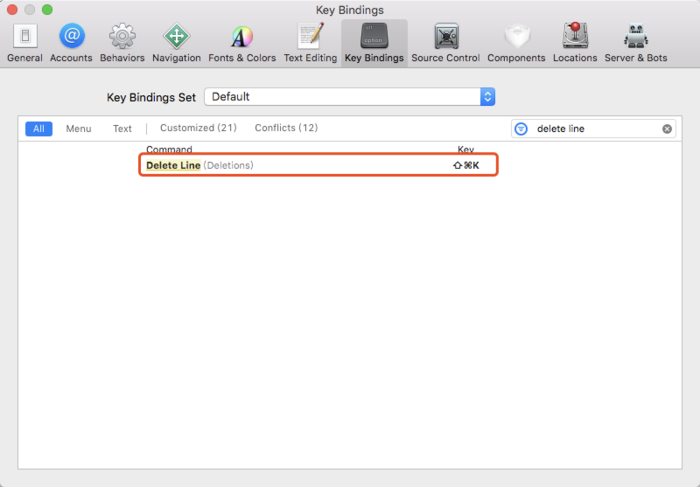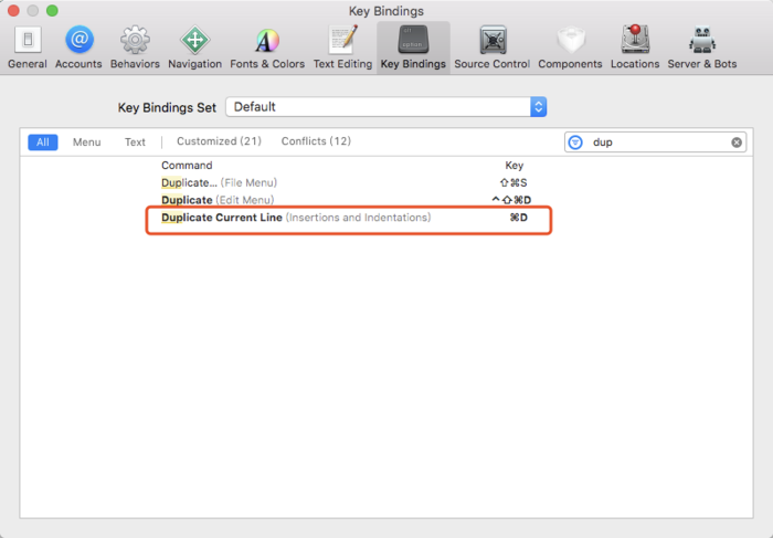 重啟一下 Xcode ,然后在 preferences 里找到 Key Bindings ,就能找到 Delete Current Line 和 Duplicate Current Line 兩個選項了,最后設置自己喜歡的快捷鍵即可