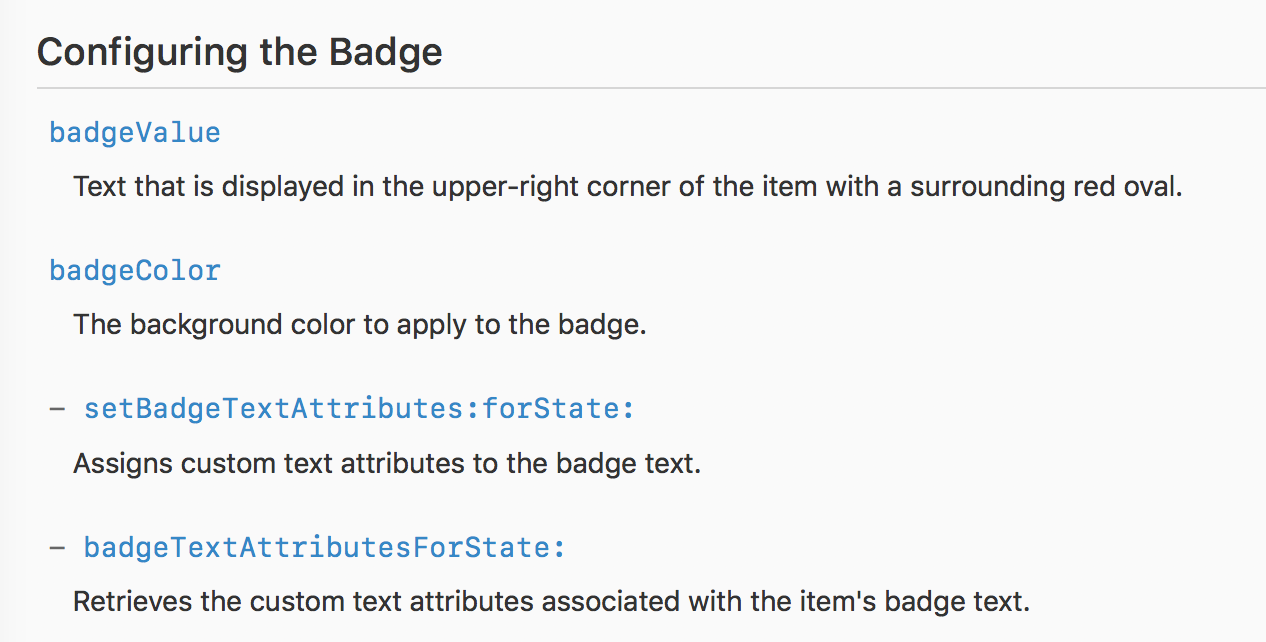 現在很多App的TabBarItem在有新消息時在右上角會有一個紅點提示,有的甚至還會有具體數目的提醒,類似我們常用的QQ、微信、微博、頭條等都會有類似的功能,這個提示在iOS中的學名叫做badge(其實是一般都這么命名而已)。在iOS的TabBarItem是自帶該屬性和控件的,我們可以根據自己的需求進行配置,下圖是iOS11中的配置文檔,可以對提示數量、顏色進行自定義設置,還可以對提示文字的屬性進行不同狀態下的配置。
