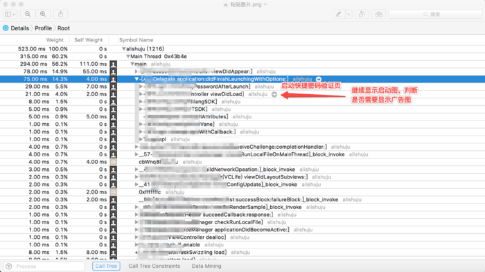 其中目前耗時最多的是快捷密碼驗證頁(PAPasscodeViewController)的創建&布局,其次是DTLaunchViewControlle里對是否要顯示廣告頁的判斷代碼??梢钥吹絇APasscodeViewController的viewDidAppear耗時了78ms,但已經沒有太大關系,此時用戶已經看到了頁面,準備去驗證指紋/密碼了。