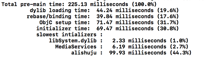 設置好后把程序跑起來,控制臺會有如下輸出,pre-main階段各過程的耗時一覽無余(Apple這個Demo有點過于夸張...)