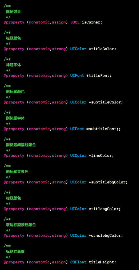 通過上面的截圖能看出來,我希望這個ActionSheet可以自定義不同的樣式,比如頭部和底部字體大小,顏色,高度;單元格字體大小,顏色,背景顏色以及行高,還有單元格不同的樣式,是只需要文字還是需要圖標加文字.這些應當提供給用戶做更多的選擇.但是這些樣式并不是剛需,所以可以作為額外代碼配置.可以單獨設置某一項,也可以一項都不設置,那就會以默認樣式來展示.通過屬性方式提供給用戶配置更多樣式: