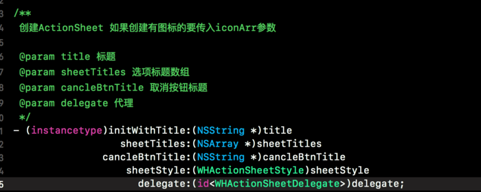 這個方法會帶有一個style參數,這時我們就可以很方便快速的創建一個tableView的實例,但是像tableView的backgroundColor這樣的參數我們就不會放在初始化方法里.對于一個ActionSheet的控件,我將標題,單元格標題,取消按鈕標題以及代理作為初始化方法需要的參數,最終的初始化方法如下: