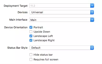 需要實現部分界面可旋轉,部分界面鎖定豎屏,首先我們需要配置TARGETS中的Device Orientation,這里是總開關,默認勾選了如圖方向: