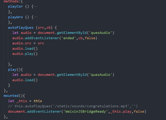 經過不斷的測試 , 發現ios下不支持的原因是 不支持動態創建的audio標簽自動播放 , 包括頁面第一次加載 , 所以轉化了思路 ,把audio標簽放在頂層的App.vue里面 , 不隨著組件的切換創建和銷毀 , 然后在App.vue里面寫一個的方法 , 接受src和callback的參數 , 在main.js掛在全局上, 每次切換的時候 ,調用該方法傳入對應的src , 代碼如下:App.vue