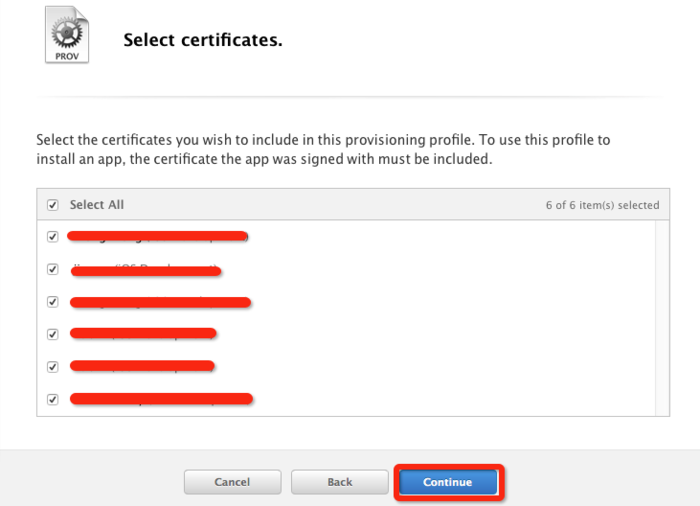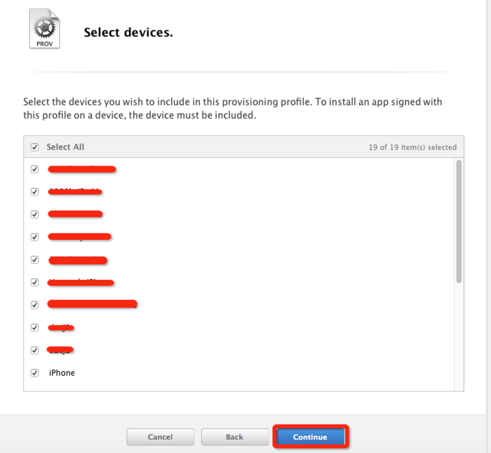選擇用于調試安裝的設備(最多100臺設備),如果是生產證書配置文件,則不會出現該頁面: