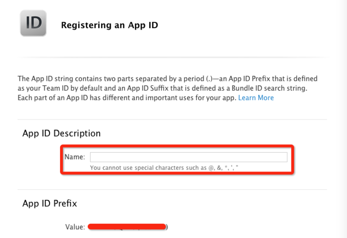 進入Register IOS App ID 界面,在"App ID Description"欄下的“name”項中輸入名稱