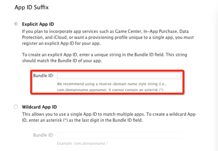 •在"Explicit App ID" 欄下的“Bundle ID”項中輸入 App ID (反域名格式,如com.company.test)
