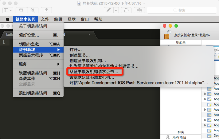 打開KeyChain(鑰匙串),點擊菜單欄“鑰匙串訪問” - “證書助理” - “從證書頒發機構請求證書”