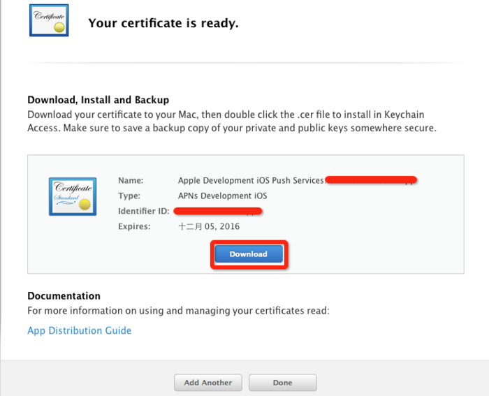 這里需要添加的是你生成的證書請求文件(CSR),“Choose File”選擇生成的.certSigningRequest文件,點擊"Generate",如圖申請開發證書完成,申請生產證書類似,這里不再贅述。