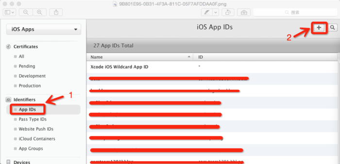 在“Identifiers”一欄下選擇“App IDs”,可查看所有已申請的App IDs,點擊右上“+”。