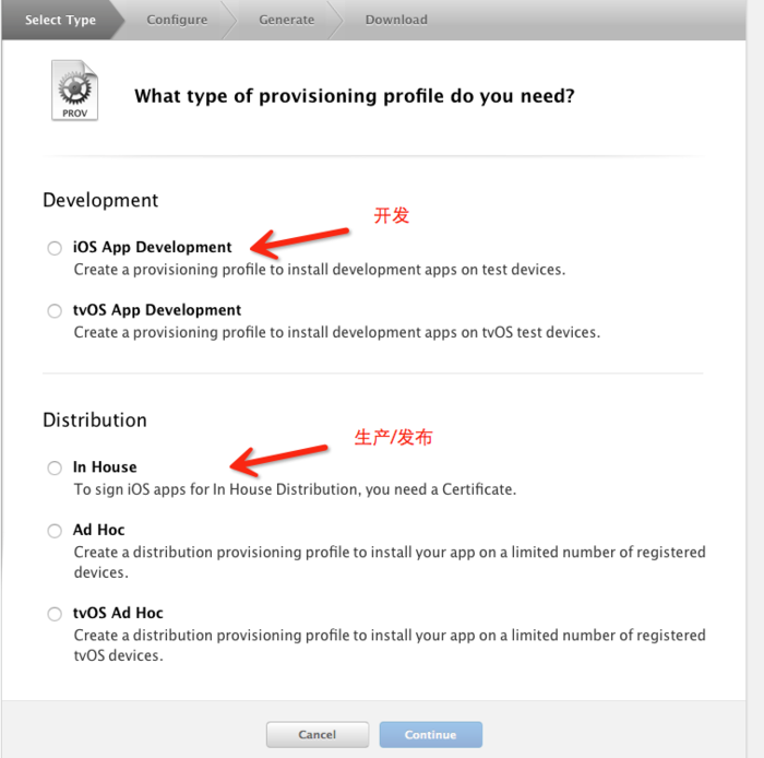 選擇開發或發布證書配置文件,這里以開發為例,點擊iOS AppDevelopment,繼續