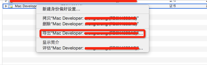 打開Keychain Access,選擇安裝成功的證書,右鍵選擇“導出: