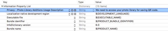 這是因?yàn)閕OS要求應(yīng)用程序開發(fā)者在允許訪問相冊(cè)之前要先獲得用戶的許可。為此,我們必須在 Info.plist 文件中添加名為 NSPhotoLibraryAddUsageDescription 的鍵,并為其添加相應(yīng)的描述: