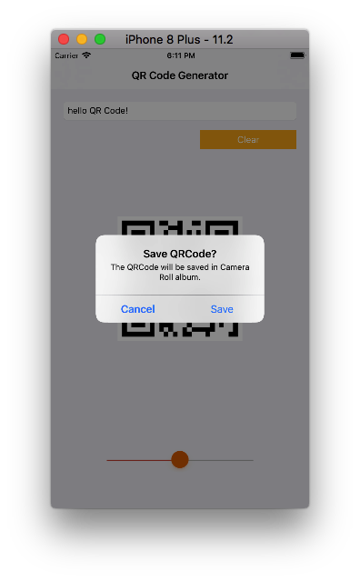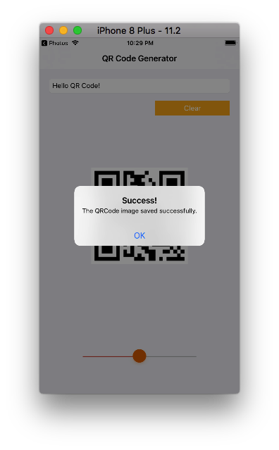 - (void)image:(UIImage *)image didFinishSavingWithError:(NSError *)error contextInfo:(void *)contextInfo{ NSString *title; NSString *message; if (!error) { title = @"Success!"; message = @"The QRCode image saved successfully."; } else { title = @"Failed!"; message = @"The QRCode image saved unsuccessfully, please try again later."; } // 使用alert view顯示二維碼保存狀態(tài) UIAlertController *alert = [UIAlertController alertControllerWithTitle:title message:message preferredStyle:UIAlertControllerStyleAlert]; UIAlertAction *action = [UIAlertAction actionWithTitle:@"OK" style:UIAlertActionStyleDefault handler:nil]; [alert addAction:action]; [self presentViewController:alert animated:YES completion:nil];}運(yùn)行程序,測(cè)試一下效果: