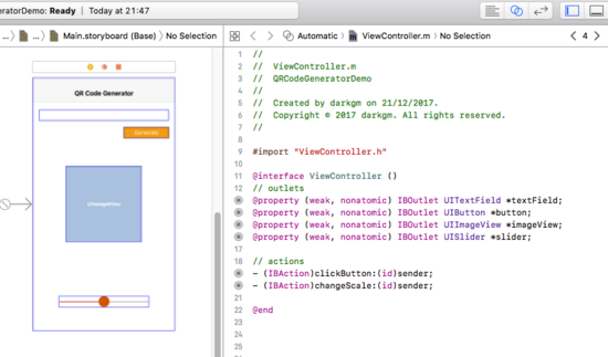 由于使用CIFilter對(duì)象生成的二維碼圖像將是一個(gè)CIImage對(duì)象,所以需要先在 ViewController.m 文件的接口部分聲明一個(gè)CIImage對(duì)象的屬性: