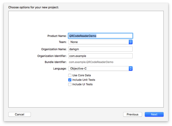 打開Xcode,創建一個新的項目(File/New/Project...),選擇iOS一欄下的Application中的Single View Application模版,然后點擊Next,填寫項目選項。在Product Name中填寫QRCodeReaderDemo,選擇Objective-C語言,點擊Next,選擇文件位置,并單擊Create創建項目。