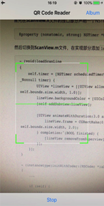 - (IBAction)startStopAction:(id)sender{ if (!self.isReading) { ... [self.view bringSubviewToFront:self.toolBar]; // display toolBar [self.view bringSubviewToFront:self.scanView]; // display scanView ... } ...}現在運行,你會看到下面的效果: