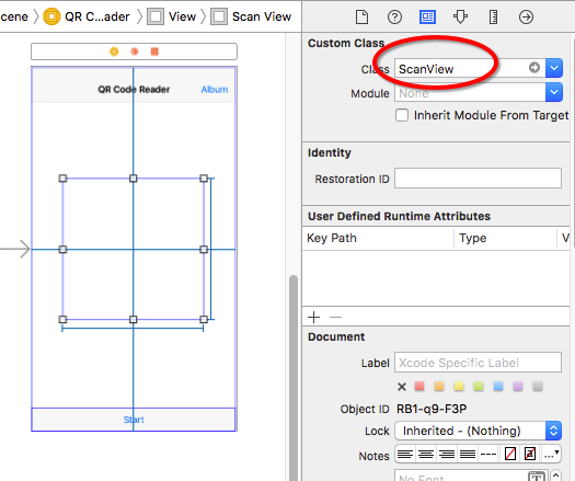 創建一個名為ScanView的新文件(File/New/File…),它是UIView的子類。然后選中視圖控制器中間添加的View,將該視圖的類名更改為ScanView: