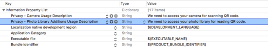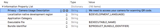 - (IBAction)startStopAction:(id)sender{ if (!self.isReading) { [self startScanning]; [self.view bringSubviewToFront:self.toolBar]; [self.startStopButton setTitle:@"Stop"]; } else { [self stopScanning]; [self.startStopButton setTitle:@"Start"]; } self.isReading = !self.isReading;}至此,二維碼掃描相關的代碼已經完成,如果想要它能夠正常運行的話,還需要在Info.plist文件中添加NSCameraUsageDescription鍵及相應描述以訪問相機: