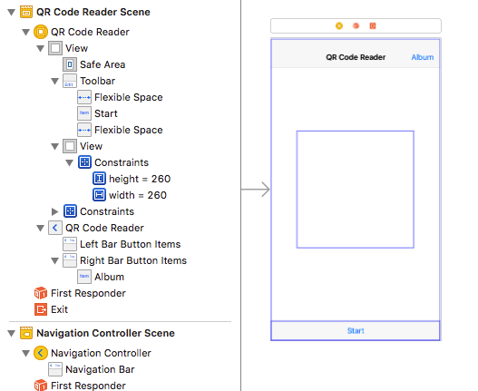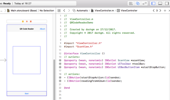 目前點擊Start按鈕,整個視圖范圍都可以掃描二維碼。現在,我們需要設置一個掃描框,以限制只有掃描框區域內的二維碼被讀取。在這里,將掃描區域設置為storyboard中添加的視圖,即scanView。