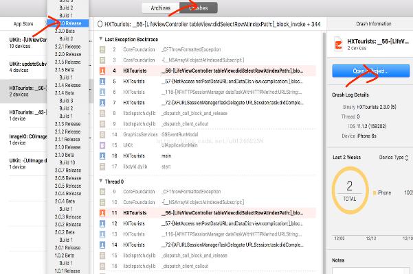 6. 選擇Crashes,找到對應的App版本號,找到對應的Crash信息,通過Open in Project找到對應的App-Project,之后Open。