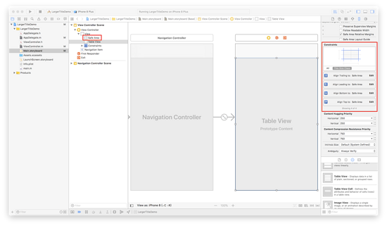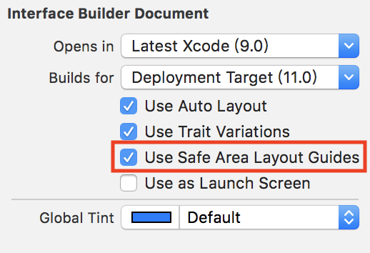 Safe Area是在iOS 9中添加的特性。如果你不需要使用Safe Area,或需要在舊版本的App中添加Safe Area,可以在XIB或StoryBoard的右側邊欄中“Show the File inspector”標簽下對“Use Safe Area Layout Guides”選項下進行勾選,以添加或刪除Safe Area。