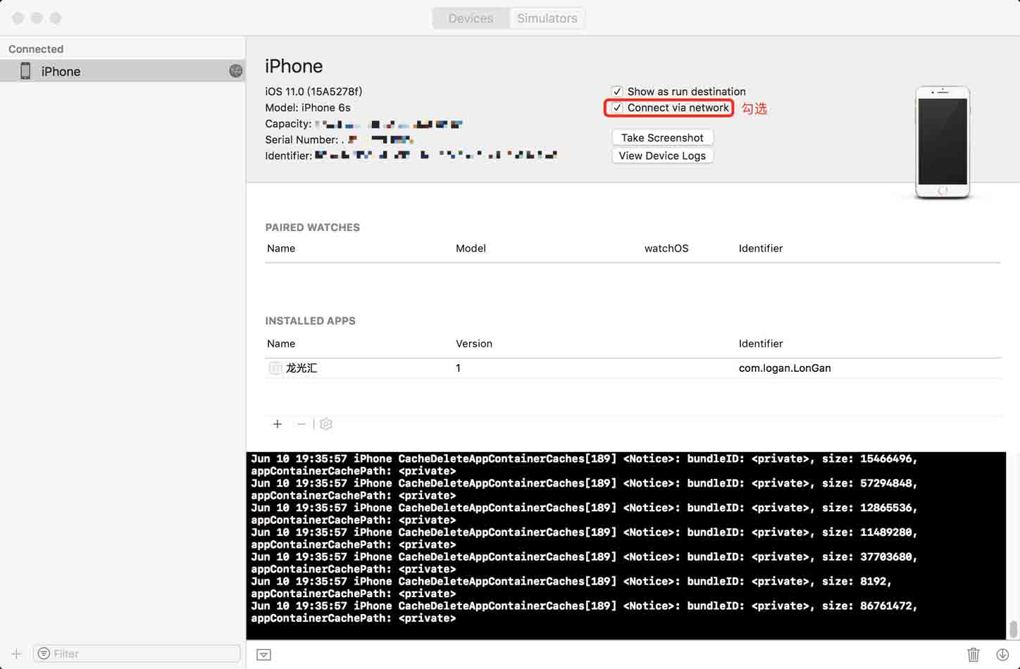 在第二步顯示網(wǎng)狀球體的基礎(chǔ)上再把Connect via network勾選去掉再勾選,網(wǎng)狀球體不再顯示,我們要確定的是把線拔掉,只要能在xcode中能選擇真機(jī)即可