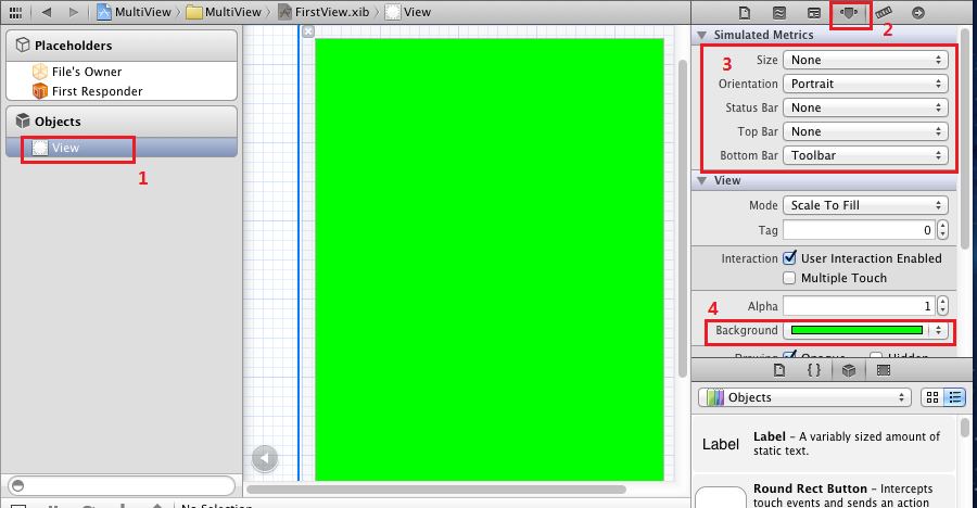 對SecondView.xib進行同樣設置,不過背景顏色設成紅色。