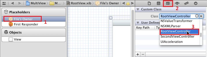 6、打開RootView.xib,在坐邊選擇File's Owner,在右邊打開Identity Inspector,在Class下拉菜單選擇RootViewController: