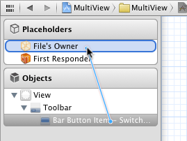 選中Switch Views按鈕,按住Control,拖到File's Owner,松開鼠標后選擇switchViews方法: