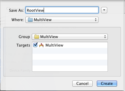 輸入名稱RootView,單擊Create,創建了一個.xib文件。用同樣的方法再創建兩個.xib,名稱分別是FirstView和SecondView。