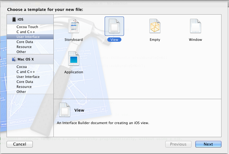 在左邊選User Interface,右邊選View,單擊Next,在新窗口中的Device Family中選擇iPhone,單擊Next,打開如下窗口:
