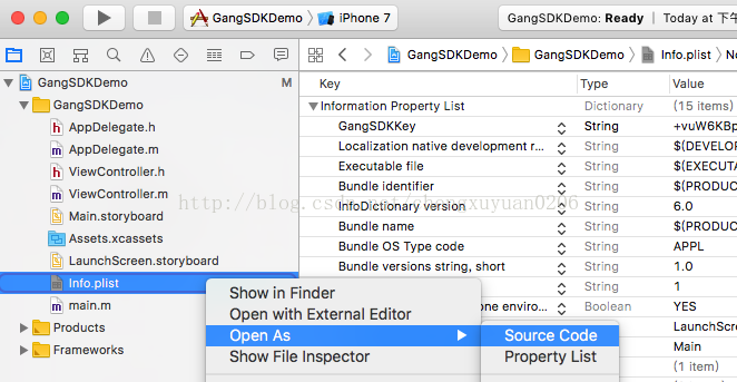 1>選中info.plist->右鍵選擇Open as -> Source Code,如下圖: