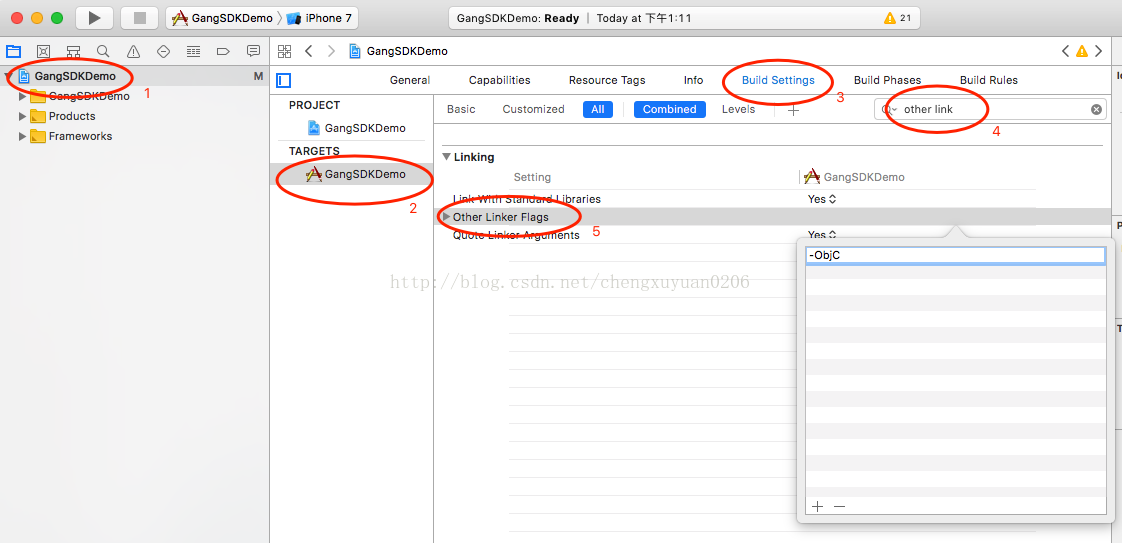 點擊項目文件->選擇項目target->選中Build Setting ->在搜索框中輸入other link ,找到Other Linker Flags ->添加-ObjC,如下圖:
