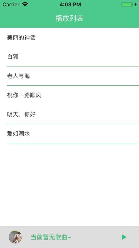 - (void)playFromURL:(NSURL *)url{ //根據(jù)地址 在本地找歌詞 NSMutableDictionary *dic = [NSMutableDictionary dictionaryWithContentsOfFile:[[NSBundle mainBundle] pathForResource:@"musiclist" ofType:@"plist"]]; for (NSString *playStringKey in dic.allKeys) { if ([[dic valueForKey:playStringKey] isEqualToString:url.absoluteString]) { self.currentTitle = playStringKey; break; } } [self stop]; if (![url.absoluteString isEqualToString:self.url.absoluteString]) { [super playFromURL:url]; }else{ [self play]; }到此為止,一個(gè)簡(jiǎn)單的播放器就差不多了,由于時(shí)間關(guān)系,可能還有些bug,希望大家能多多提出來(lái),我好進(jìn)行修正。下面還是附上 demo ,后續(xù)我還將加一個(gè)功能,因?yàn)檫@兩天公司有個(gè)很老的項(xiàng)目,有個(gè)下載問(wèn)題,有點(diǎn)蛋疼,所以準(zhǔn)備些一個(gè)隊(duì)列下載,然后順便加到播放器上。