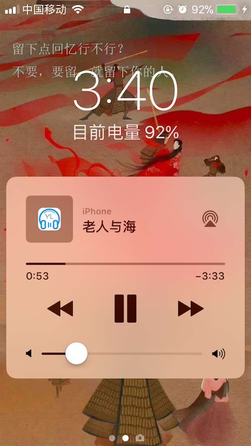 NSMutableDictionary *musicInfoDict = [[NSMutableDictionary alloc] init]; //設(shè)置歌曲題目 [musicInfoDict setObject:self.currentTitle forKey:MPMediaItemPropertyTitle]; //設(shè)置歌手名 [musicInfoDict setObject:@"" forKey:MPMediaItemPropertyArtist]; //設(shè)置專輯名 [musicInfoDict setObject:@"" forKey:MPMediaItemPropertyAlbumTitle]; //設(shè)置歌曲時(shí)長(zhǎng) [musicInfoDict setObject:[NSNumber numberWithFloat:totalTime] forKey:MPMediaItemPropertyPlaybackDuration]; //設(shè)置已經(jīng)播放時(shí)長(zhǎng) [musicInfoDict setObject:[NSNumber numberWithFloat:currentTime] forKey:MPNowPlayingInfoPropertyElapsedPlaybackTime]; [[MPNowPlayingInfoCenter defaultCenter] setNowPlayingInfo:musicInfoDict];