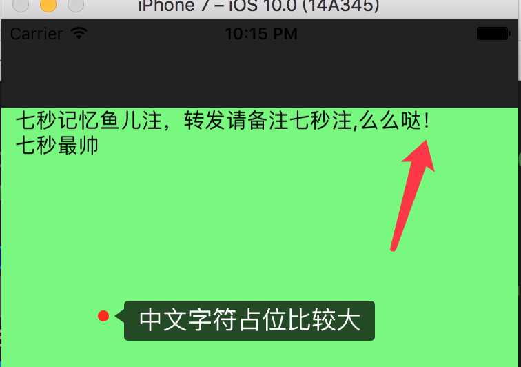 let label = UILabel(); var text = "七秒記憶魚兒注,轉(zhuǎn)發(fā)請備注七秒注,么么噠!"; label.numberOfLines = 0; label.font = UIFont.systemFont(ofSize: 15); let size = text.wj_computedTextHeight(font: 15, size: CGSize.init(width: view.bounds.width, height: CGFloat(MAXFLOAT))); var text1 = text; text.append("七秒最帥"); let size1 = text.wj_computedTextHeight(font: 15, size: CGSize.init(width: view.bounds.width, height: CGFloat(MAXFLOAT))); if size.height != size1.height { text1.append("/n"); text1.append("七秒最帥"); text = text1; } label.text = text; label.frame = CGRect.init(x: 10, y: 64, width: size1.width, height: size1.height); view.addSubview(label);抽取的方法