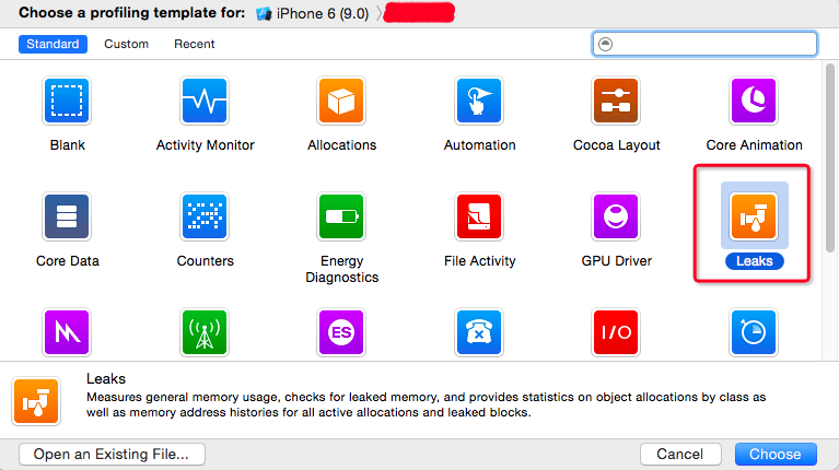 按上面操作,build成功后跳出Instruments工具,選擇Leaks選項