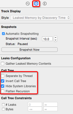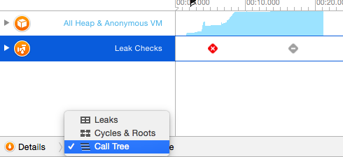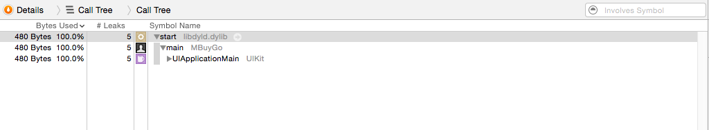 4.下面就是定位修改了,此時選中有紅色柱子的Leaks,下面有個"田"字方格,點開,選中Call Tree