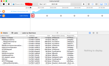 3.由于Leaks是動態監測,所以我們需要手動操作APP,一邊操作,一邊觀察Leaks的變化,當出現紅色叉時,就監測到了內存泄露,點擊右上角的第二個,進行暫停檢測(也可繼續檢測,當多個時暫停,一次處理了多個).如圖所示: